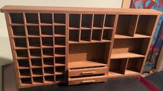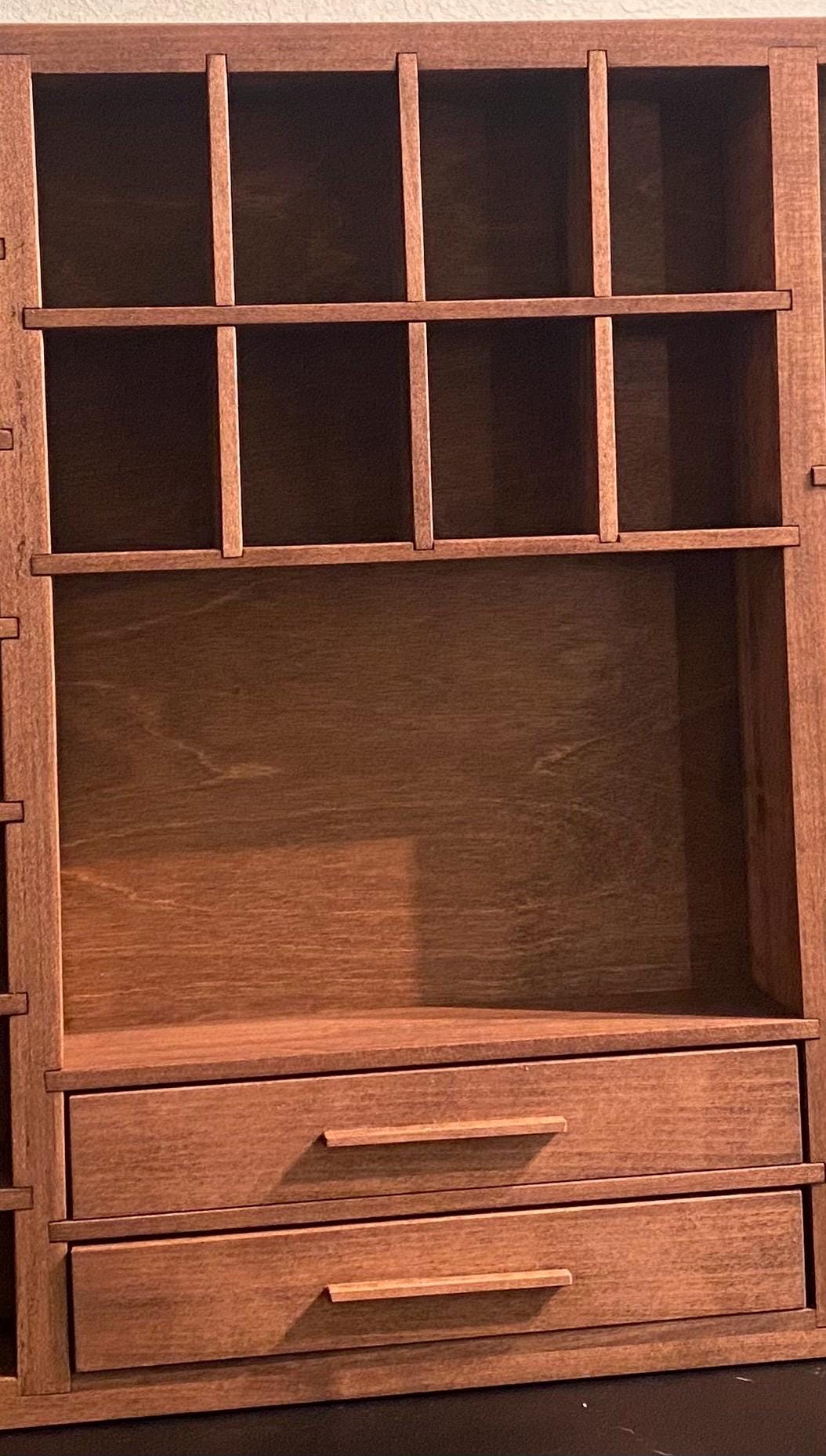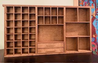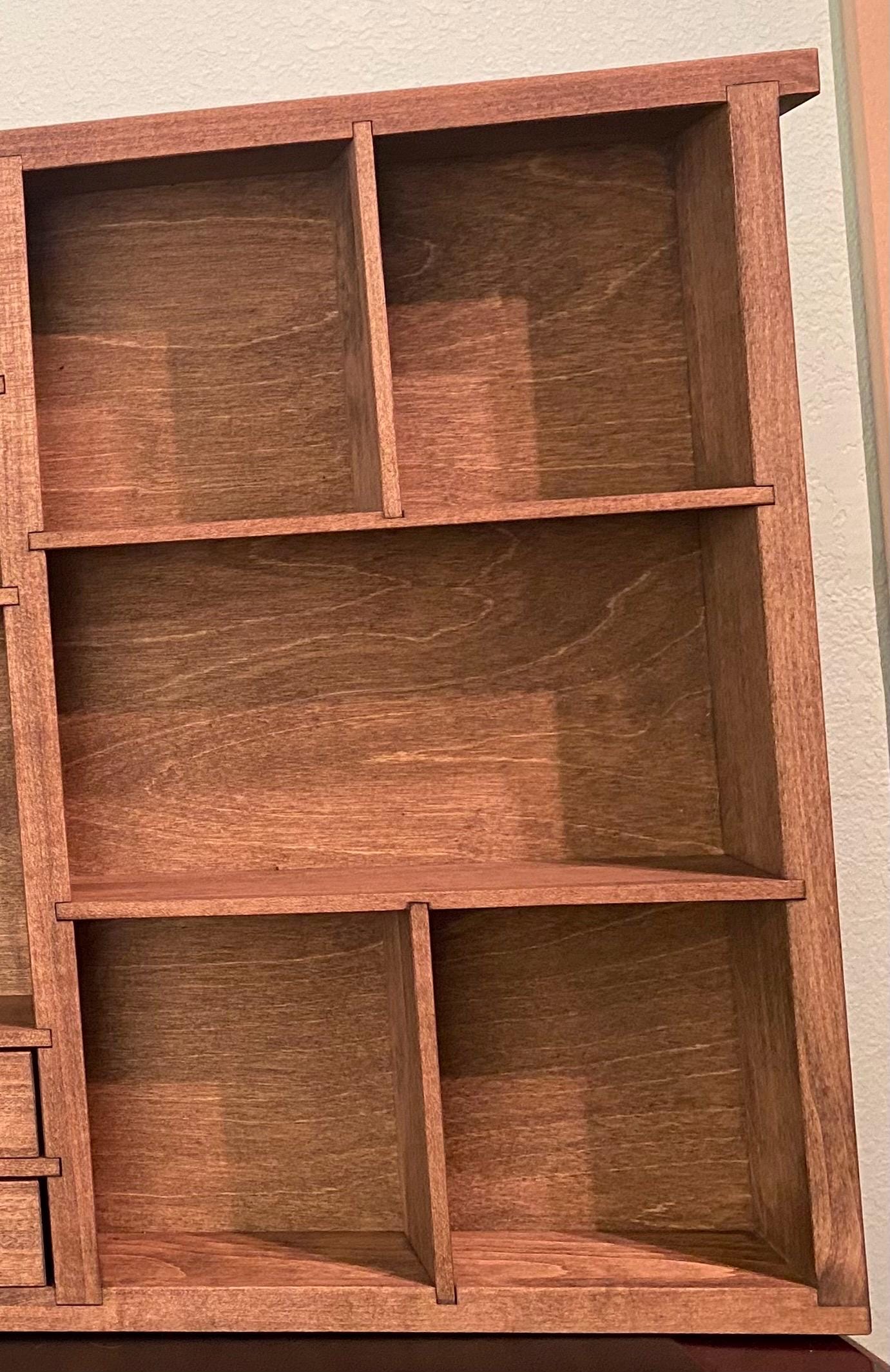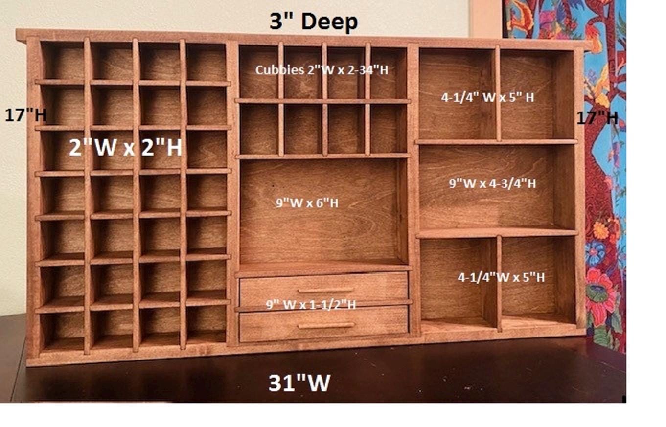 Showcase your treasures with this handcrafted, wall-mounted display shelf. Solid wood construction. Designed to hold your most cherished small items, this versatile organizer features 44 compartments in varying sizes- perfect for crystals, nature finds, miniatures, tincture bottles, and other collectables.