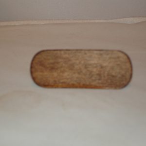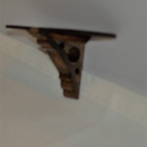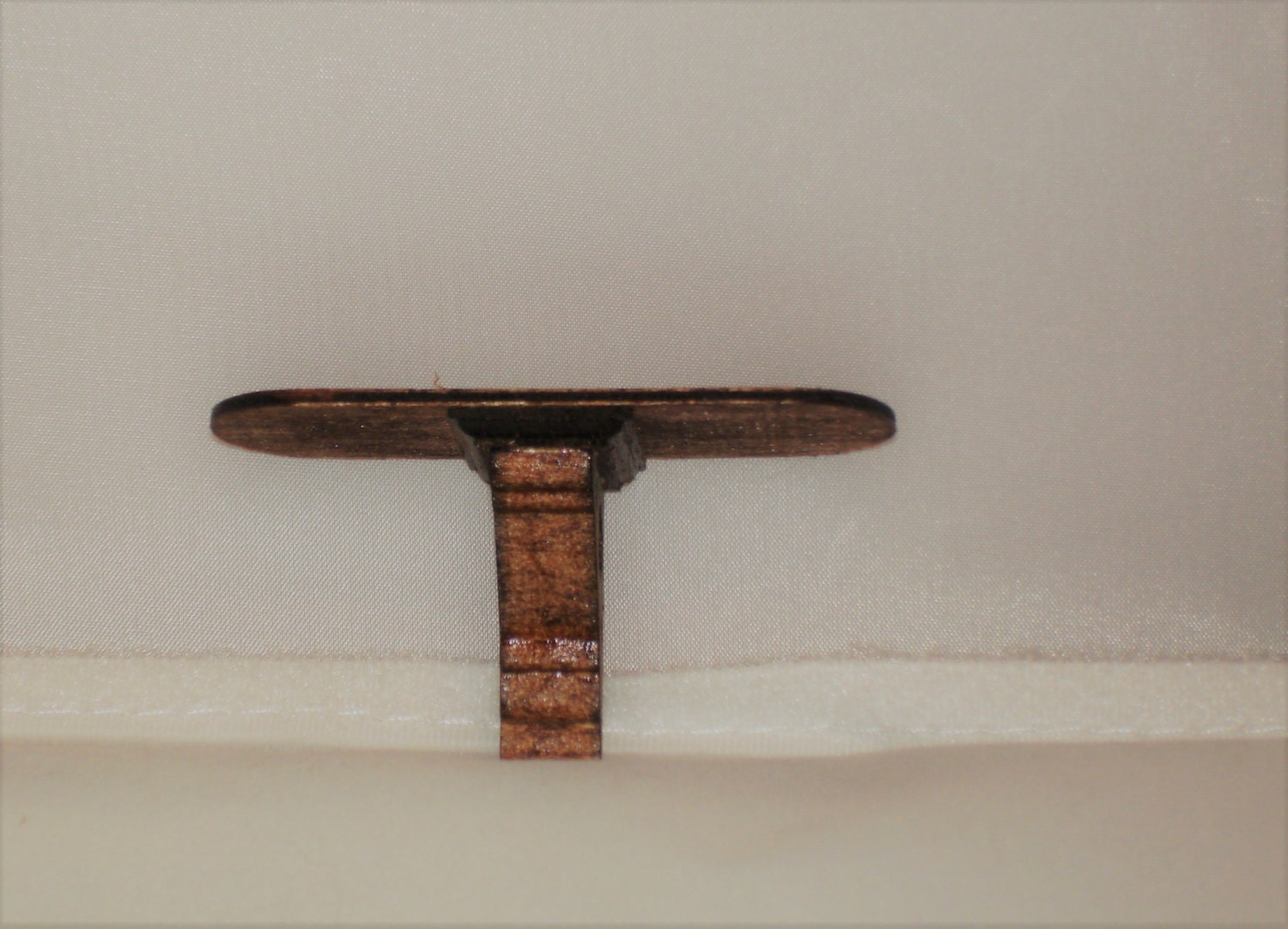 Oval dollhouse shelf, 2 and 5/8″ x 1″, finished with a dark cherry oak stain. Including the brackets, it is 1.25″ tall.